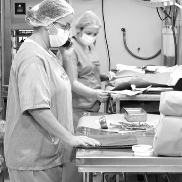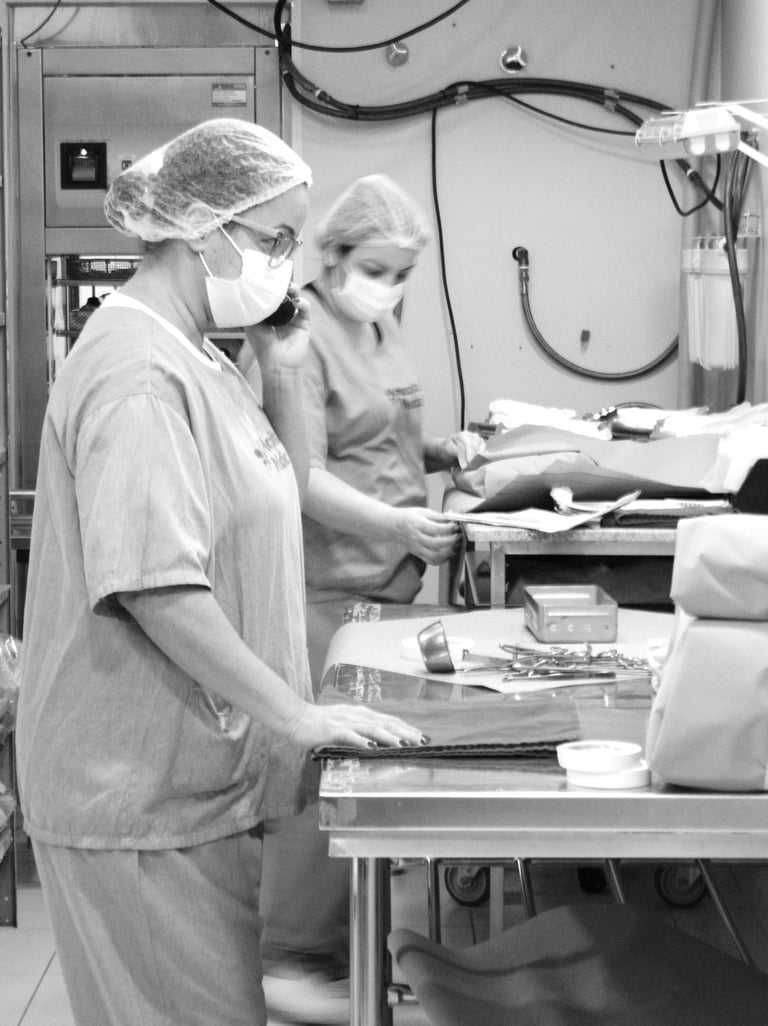 Essa imagem transmite muito da rotina silenciosa, meticulosa e dedicada de um CME (Central de Material Esterilizado) da qual as pessoas desconhecem a importância. Tirei a foto preto e branco trouxe uma carga emocional, que valoriza o trabalho invisível, mas essencial. As personagens na imagem, a primeira em primeiro plano, mais focada com o telefone na mão, mostra que além de lidar com instrumentais, a atenção a assuntos relacionados a todos os setores do hospital é toda e real.