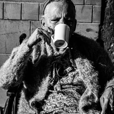 A foto apresenta a minha avó. No dia em que tirei a foto, ela havia acabado de chegar de uma consulta, onde saiu de madrugada com a minha mãe. Quando chegou de manhã, resolveu tomar um sol enquanto tomava seu café. Ela faz hemodialise três vezes na semana, o que dificulta a situação da saúde dela, retratada pela paleta em preto e branco na fotografia.