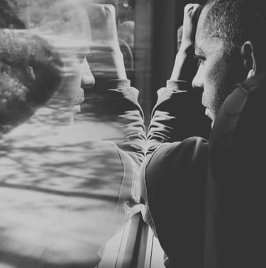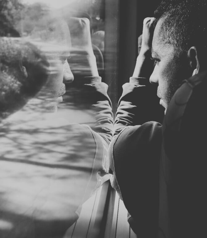 A foto tem um enquadramento no perfil da pessoa para destacar sua expressão pensativa. Foto feita em primeiro e segundo plano, com destaque para o reflexo na janela. A luz natural justifica as sombras e o reflexo, tornando a imagem atrativa.