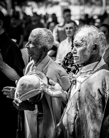 A profundidade de campo reduzida permite um foco emocional nos vaqueiros, ao passo que o fundo borrado, mas ainda povoado, sugere uma comunidade unida pela fé. A luz natural rasante reforça o contraste, desenhando sombras que destacam os contornos dos rostos e intensificam a carga emocional da cena.