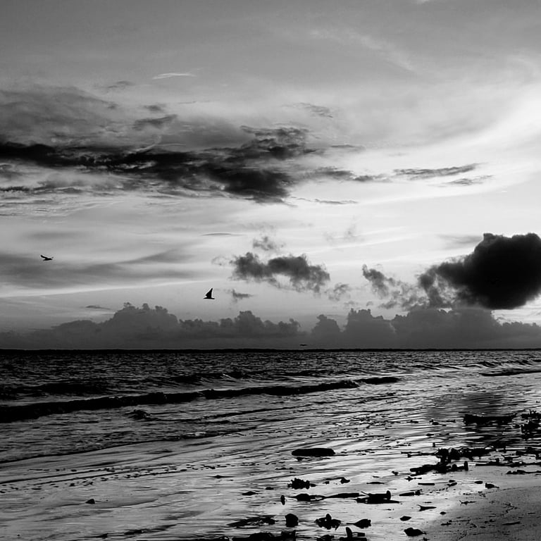 A fotografia em preto e branco retrata o amanhecer solitário na praia, destacando contrastes, texturas e o voo livre das aves. Inspirada em Sebastião Salgado, a composição amplia o horizonte para transmitir silêncio, liberdade e contemplação.