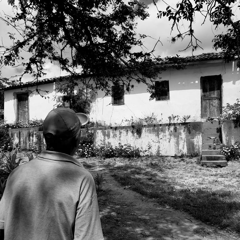 A fotografia apresenta um senhor de 75 anos no sertão baiano, observando a antiga casa de sua mãe, onde viveu com seus 8 irmãos, criou seus 9 filhos e também se despediu dos pais. A imagem busca resgatar a memória afetiva e familiar, representando o reencontro entre o sujeito e o espaço que guarda sua história. O tema central é a permanência da memória no espaço físico, explorando a relação entre tempo, afeto e pertencimento. [...]