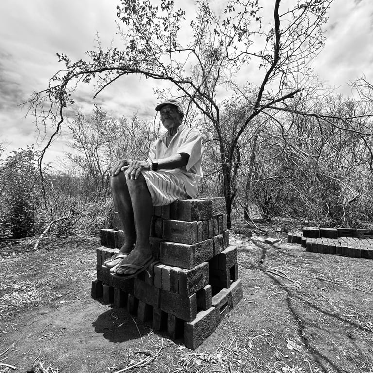No coração do sertão, mais especificamente em Central - BA, onde a terra racha e o tempo parece suspenso, um homem repousa. Ele não está sentado por vaidade, mas por necessidade. Seu trono é feito dos tijolos que ele mesmo molda com as mãos — barro, suor e silêncio. Esta imagem é um retrato da dignidade invisível, por 0,25 centavos cada tijolo, o senhor Edson sustenta uma casa, uma família, uma história. Mas ali, empilhados sob o peso do corpo e do tempo, os tijolos se tornam símbolo. Símbolo de resistência, de simplicidade, de uma vida dura que não perdeu a beleza. [...]