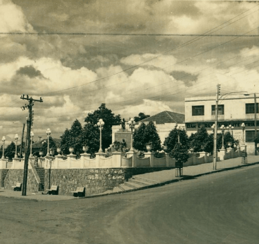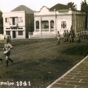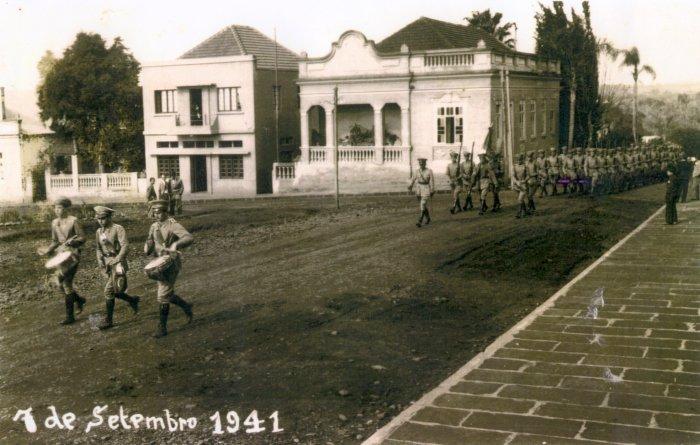 Marcado em registro original da época explanando cultura e patriotismo. Nota-se que há populares observando a apresentação. Registro realizado a luz do dia, em preto e branco onde há militares tocando instrumentos musicais e marchando com suas botinas. Além disso, o chão era batido com pedras aproximando da calçada.