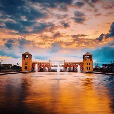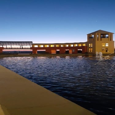 A foto original já capturava a beleza do Parque Tanguá de forma imersiva, usando a passarela como guia visual. Minha recriação buscou isolar a grandiosidade arquitetônica e o efeito da iluminação noturna. Optei por um close-up focado em uma das torres e no reflexo na água, eliminando a linha do horizonte e qualquer elemento humano para criar um ambiente mais abstrato e contemplativo. Usei um alto contraste e trabalhei a saturação das luzes para transformar o prédio em uma escultura luminosa. O objetivo foi mudar a narrativa de "lugar de passeio" para "obra de arte monumental", focando no detalhe dramático para uma campanha de publicidade com apelo estético mais refinado e moderno.