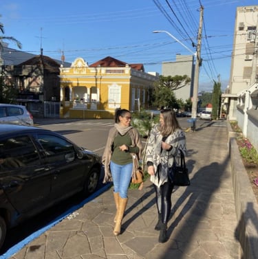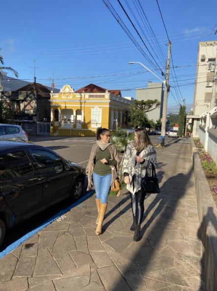 Na foto conta duas modelos que estão caminhando e posando de forma espontâneas, vestidas com looks de inverno para a loja Vèstiê, localizada no centro da cidade de Arroio do Meio, estado do Rio Grande do Sul.
