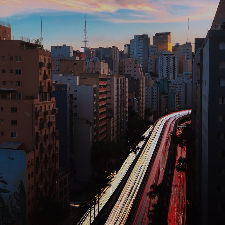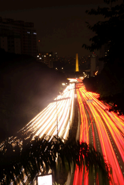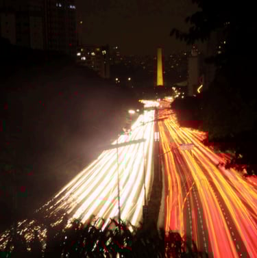 Na minha recriação, optei por usar a técnica de longa exposição, capturando o fluxo de luzes dos carros a noite. Essa escolha é moderna e coloca em evidência o dinamismo e a intensidade da vida paulistana. Diferente da luz natural do pôr do sol, explorei a iluminação artificial da cidade, reforçando a ideia de São Paulo como “cidade que não para”. O enquadramento foi pensado para destacar a velocidade e o movimento, transmitindo uma sensação de energia contínua, característica marcante da identidade paulistana.