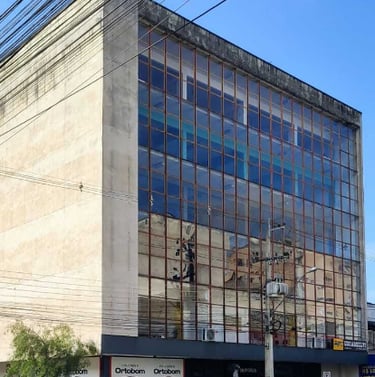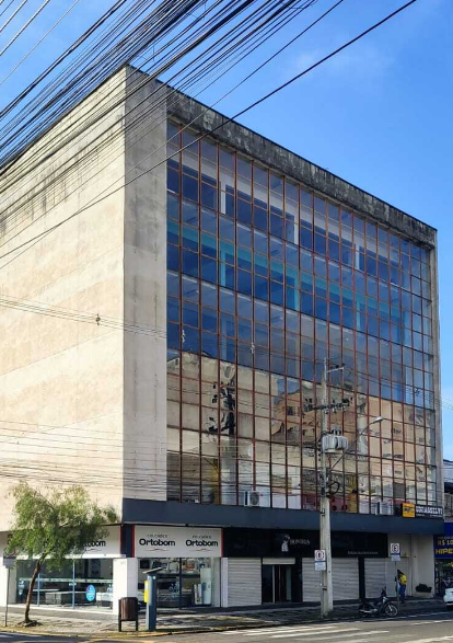 A imagem retrata um cenário urbano moderno, onde a arquitetura comercial se integra ao cotidiano da cidade. O enquadramento em perspectiva valoriza a imponência do edifício e sua posição estratégica na esquina, enquanto os elementos como motos, fios e sinalização reforçam o dinamismo da vida urbana. As cores neutras e os reflexos nas janelas transmitem sofisticação e funcionalidade. A iluminação natural suave cria uma atmosfera acolhedora e realista, sugerindo movimento e acessibilidade. A composição transmite de modernidade, confiança e integração com o ambiente urbano.