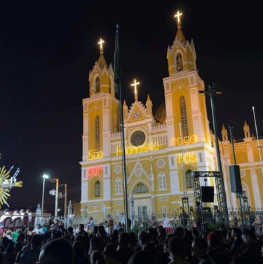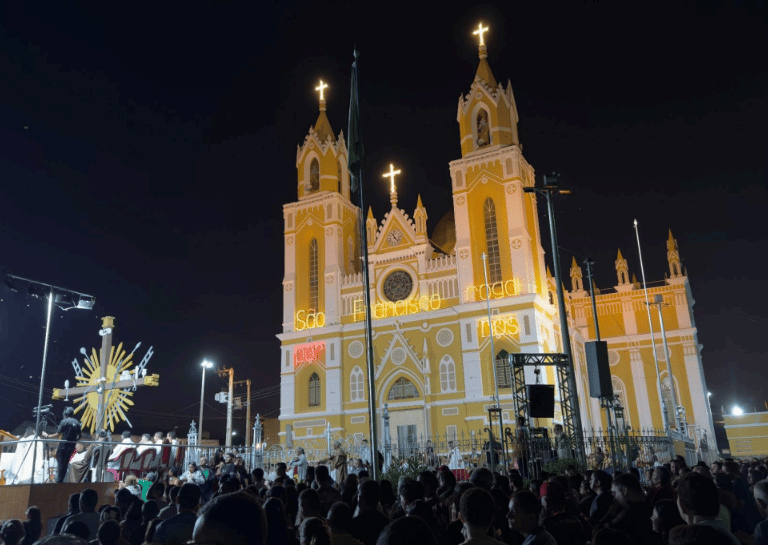 O foco nesta imagem noturna da Basílica de Canindé busca capturar a sua dimensão como um vibrante polo de fé. A escolha pela fotografia à noite não é aleatória; ela utiliza a iluminação artificial para conferir ao templo uma aura dramática e monumental, fazendo com que sua arquitetura gótico-barroca se destaque intensamente contra o céu escuro. As luzes acesas transformam a Basílica em um farol espiritual. Mais crucialmente, a inclusão da multidão em frente à fachada ressalta o significado do local como o coração da Romaria de São Francisco das Chagas. Esta perspectiva celebra o Santuário não apenas como uma edificação histórica, mas como um espaço vivo, expressando o fervor, a energia e o sentimento coletivo da fé nordestina.