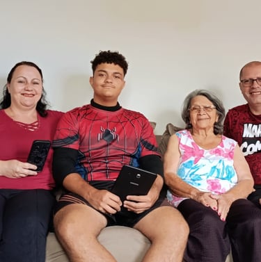 Eu coloquei minha família sentada no sofá de frente para a SmartTV. Usado o mesmo ângulo da foto do outdoor e com iluminação natural vindo da janela. Alguns com a camiseta vermelha buscando uma cor semelhante da campanha. Sem imagens ao fundo. Apenas a família no sofá.