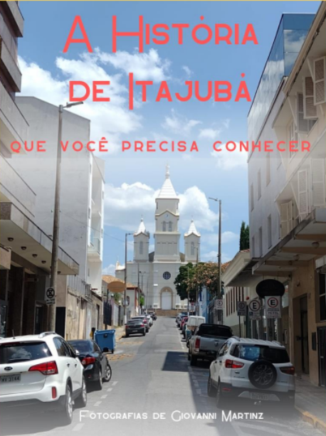 encontrei a imagem da propaganda de um livro sobre a história de Itajubá lançada em 1987,autoria de Armelim Guimarães. Na capa uma imagem antiga (1897) de uma rua do centro da cidade com fontes em vermelho “história de Itajubá”. Refiz a capa do livro para uma em cores com fotografia da Igreja Matriz que fica no final da rua, onde se vê carros estacionados na rua asfaltada e a igreja ao fundo num dia de céu azul. Procurei seguir a mesma composição da foto original com linhas guia conduzindo o olhar para a igreja, porém com simetria. Para o título, usei fontes LOTUS EATER SANS do Canva em vermelho sobre a parte superior do céu azul, com base nas cores do círculo cromático e acrescentei “A” ao título e um chamado para ação “que você precisa conhecer” para despertar o interesse do leitor, no rodapé inseri na cor branca: “fotografias de Giovanni Martinz” usando a mesma fonte. Inseri um efeito parecido com nuvem para deixar mais suavizada a imagem da capa do livro.