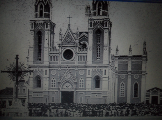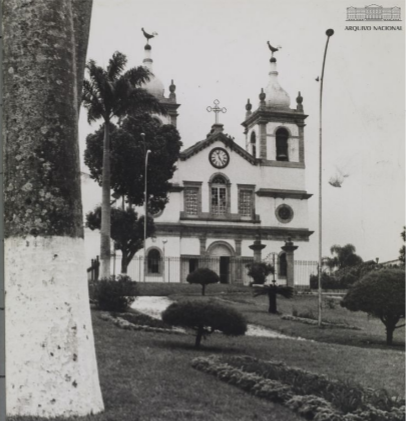Foto da igreja católica de Vassouras Rj no ano de 1970. Foi tirada em preto e branco, a imagem um pouco estourada e não tem o enquadramento de toda paisagem.