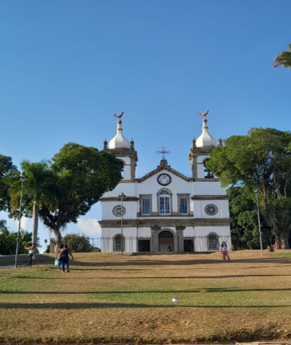 A foto da igreja foi tirada atualmente no ano de 2025. A cores e as luzes alinhadas na imagem e o enquadramento da foto em plano geral de forma nítida onde dá pra ver as pessoas, os galos e os formatos das árvores.