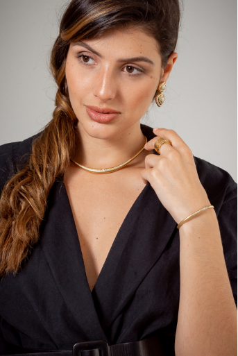 Ao recriar essa imagem (imagem 2), optei por utilizar luz artificial, com flash e uma sombrinha difusora. No entanto, procurei manter os mesmos princípios de composição: a posição da mão da modelo e o decote da roupa direcionam o olhar para as joias. O enquadramento foi pensado para ser bem semelhante ao da imagem original, incluindo o corte proposital no topo da cabeça, como ocorre na imagem 1.