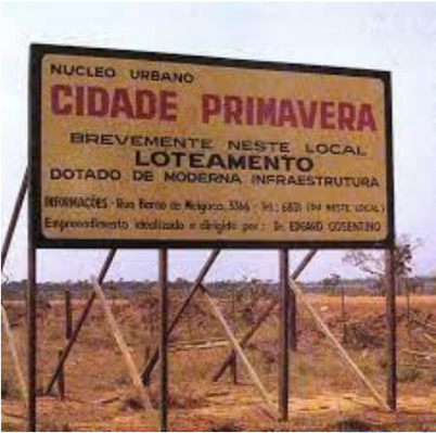 O desafio nos pede pra trazer uma propaganda antiga da minha cidade. Eis que a propaganda mais antiga que consegui foi um outdoor do loteamento da Cidade Primavera lançado oficialmente em 1979, ainda um distrito da cidade vizinha, Poxoreo. Dr. Edgard Cosentino foi o pioneiro nos loteamentos da região e aqui represento a Cosentino Incorporadora na minha versão voltada para um publico mais jovem.